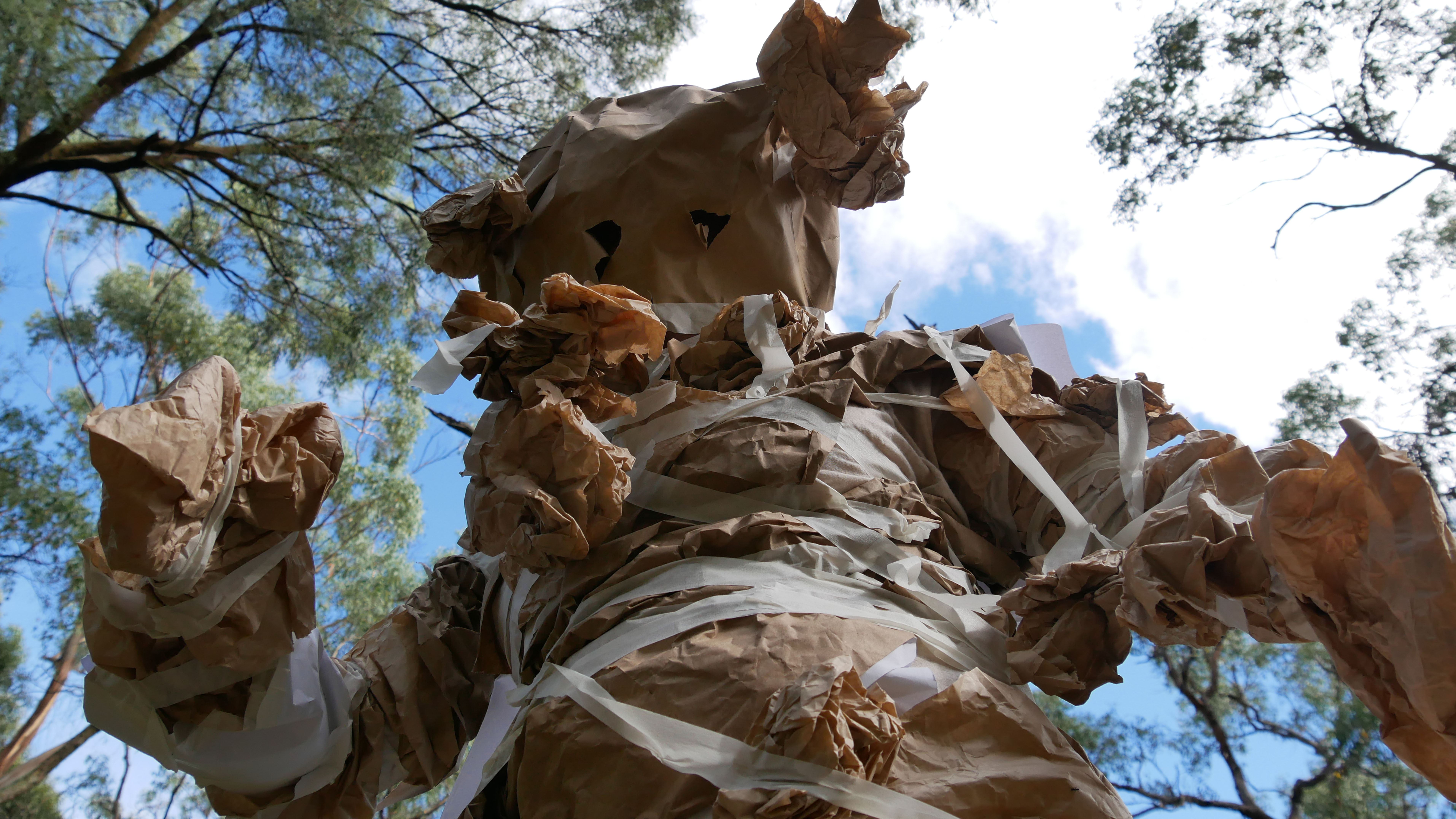 The artist’s body is transformed into the waste paper monster, using recycled paper to create the costume for the character who inhabits a world of fallen, dead, burnt and cut trees. The harsh sound of chainsaws, falling trees and axes disrupt the serenity of the bush as PAPERSAURUS journeys through our changing landscape witnessing and participating in environmental destruction.