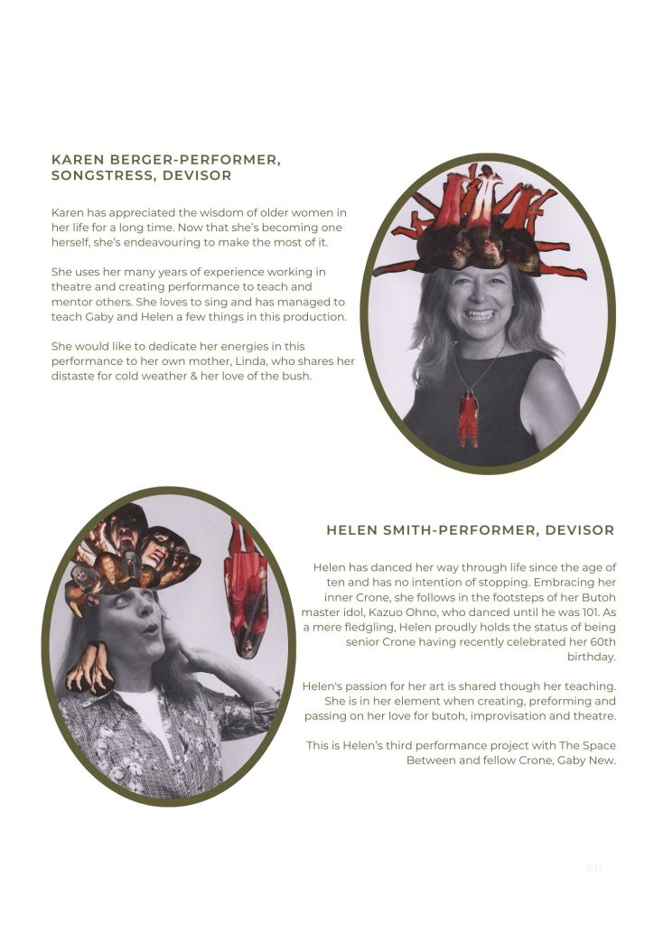 New explains that Butoh is the perfect art form for this work as it is often used to represent the oppressed, the overlooked and those on the fringes of society… like the Crones or older women who are often perceived as invisible.