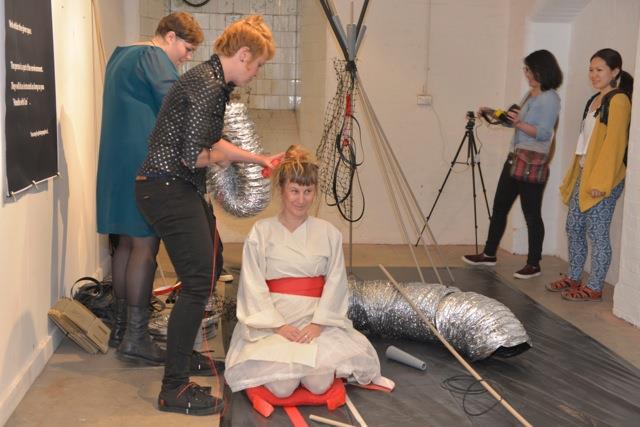 In HwC I the audience is offered a set of instructions and a collection of labelled objects. One of the objects is a person, the other objects were chosen for their symbolic archetypal implications. In HwC II the objects were labelled ‘person, tools and materials’ .